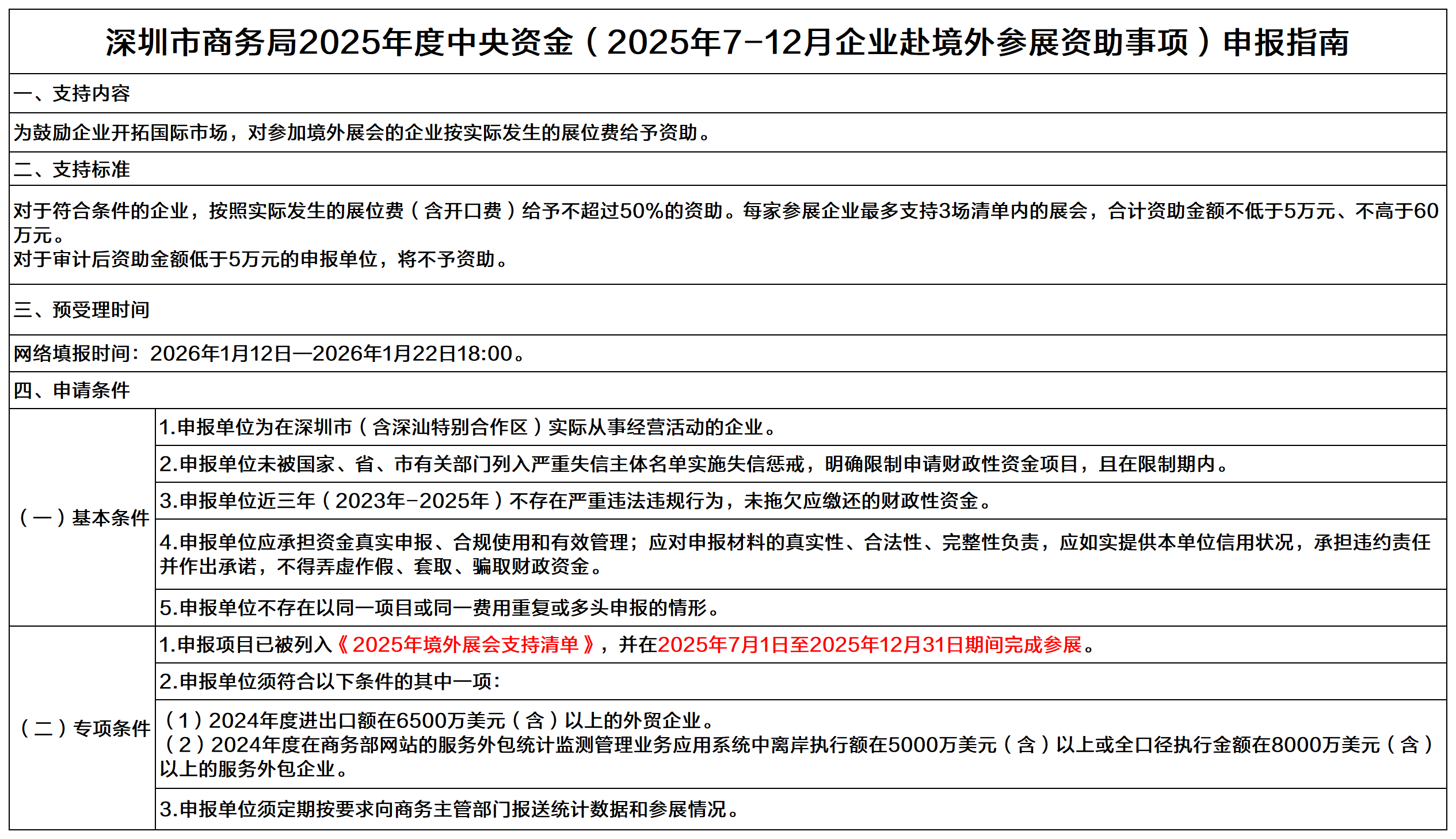 为支持我市“20+8”产业集群等重点产业在发达国家及“一带一路”共建国家等重点市场参加境外展会,帮助企业开拓多元化国际市场,我局计划于2026年1月12日-1月23日开展2025年度中央资金(2025年7-12月企业赴境外参展资助事项)的申报工作。具体如下: