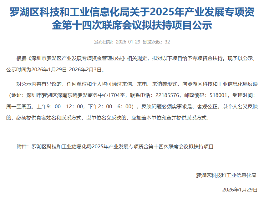公示!罗湖区2025年产业发展专项资金第十四次联席会议拟扶持项目公示