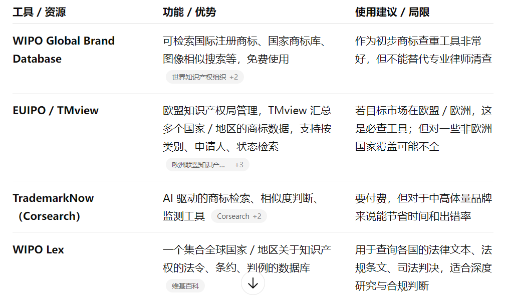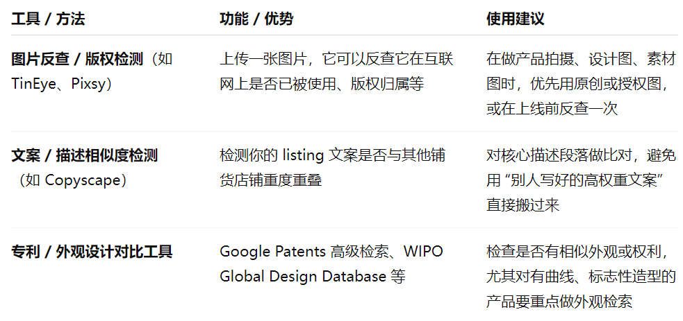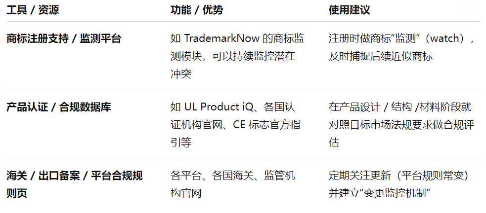 但真正能在关键时刻“保命”的,其实是一些不太起眼的工具:合规查询、侵权规避、备案注册。 今天就来盘点几类“冷门但实用”的工具和小技巧? 一、查询工具 这些工具不是“卖货提升”的直接利器,而是减少踩坑风险、保护长期运营的基石。 二、侵权 / 风险规避工具 当你设计或准备上线产品、文案、图片时,这些工具可以帮你先做“安全检查”,减少被投诉或封号的风险。 三、备案 / 注册 / 监测辅助工具 很多卖家忽视备案、商标注册、监测这些“间接成本”,结果在遇到侵权、投诉、平台政策变动时,很被动。 四、实操小技巧 & 风险防线 除了用工具,还要在运营流程/思维上加入“防火墙”机制。下面是几个实战技巧: 1.主题关键词 + “patent / lawsuit / recall” 搜索 2.建立“风险清单 / 分类管理表” 3.设定合规审核节点 4.定时关注平台与国家法规更新 5.规模化业务考虑专职/外包法律 / 合规支持 跨境电商不仅仅是流量、选品、广告的战斗。真正能撑住你业务走得远、走得稳的,是合规、知识产权、备案机制这些“看不见”的底层防线。 希望这篇工具 + 实操思路结合的盘点,能给你/你的团队在“关键环节”多一道保险。