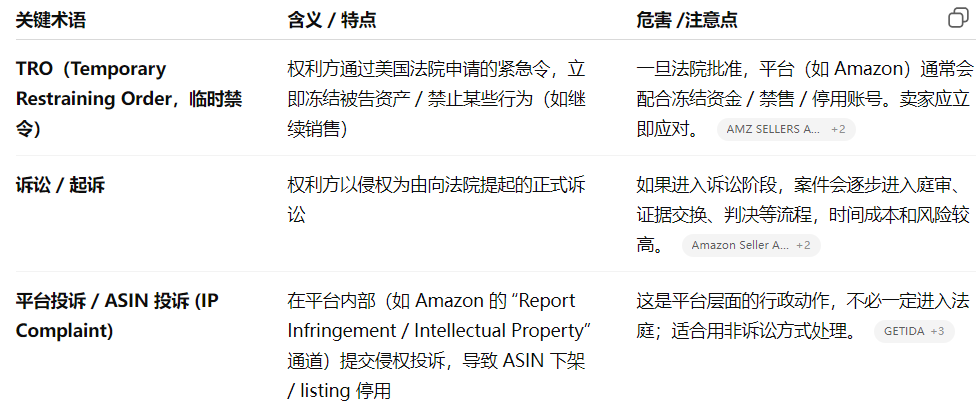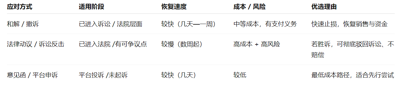 一、TRO vs 投诉 vs 平台申诉 核心判断点: 1.如果你收到了法院层面的通知 / TRO 命令 / 资金被冻结,那就已进入司法层面,应优先考虑法律动议 / 和解路径。 2.如果还只是被平台投诉 / listing 被下架(但尚未涉及法院),那“不侵权意见函”路径可能是最快的自救方式。 二、路径一:和解 / 达成协议 1.适用场景 对方已经提起诉讼或已有法院 TRO 令,但你判断自己如果继续打可能成本太高。 你急需恢复销售 / 提取被冻结的资金 / 解禁 ASIN。 你愿意为“换时间”付出一定费用(赔偿 / 和解款)。 2.操作思路 ①确定对方身份与案件详情 ②评估侵权风险 /责任强弱 ③律师或代理发起和解谈判 ④签署和解协议 / 撤诉 / 递交法院文件 ⑤通知平台 /提交通知 ⑥款项 / 解冻 /恢复流程 平台(如 Amazon)在收到法院撤诉 / retraction /解冻指令后,一般会在数个工作日内释放资金或恢复 ASIN。 注意点 1.在谈判中,要尽可能保留“撤诉 + retraction”条款 —— 让对方在退款 /解冻后主动提交撤诉 / retraction。 2.和解协议里应约定对方不得再进行同一 ASIN /产品的投诉。 在提交给平台的 retraction /撤诉材料中,格式要符合法院 /平台要求,避免因为格式问题被驳回。 3.和解虽然快速,但在账面上看也可能被竞争对手认为“有错就赔”——要权衡公司长期形象。 三、路径二:法律动议 / 请法院解禁 当你认为原告起诉存在法律瑕疵或管辖权问题时,这条路径就是你的反击利器。它适用于已经进入法庭程序、资金被冻结 / TRO 已经下发的情况。 1.适用场景 收到法院的 TRO 或诉讼,以及法院管辖权 /合并不当 /起诉程序问题等可争议点。 你或你的律师认为原告起诉程序存在失误 /缺陷。 你有比较充足的证据 /抗辩理由,有能力承担一定的法律成本。 2.操作思路 1.请合适的美国律师(具备跨境 /电商 /知识产权经验)出面 2.准备动议文件 Motion to Dismiss / Motion to Strike / Motion to Dissolve TRO:根据案件特点提出驳回 / 解除申请 要求法院审查被投诉产品是否真的落入专利 /商标 /版权权利主张范围 如果是 TRO,还可以申请法院解除冻结 /放宽禁令 3.提交法庭 / 对方答辩 4.庭审 /法官裁定 5.法院判令生效后提交给平台 注意点 1.必须在法律规定的期限内提交动议,否则失去时效权利。 2.提交的动议材料要严格符合法院程序要求,结构清晰、论证充分。 3.在诉讼过程中要积极应对证据交换、对方反驳、庭审策略等。 4.如果案件规模不大的话,诉讼成本可能超过风险收益比。 四、路径三:不侵权意见函 / 申诉报告 这是平台层面的非诉讼自救路径,适用于尚未进入法院阶段,或你认为产品实际不构成侵权的情形。 1.适用场景 平台(如 Amazon)内部收到投诉,listing 被下架 / 被提交侵权警告,但尚未收到账面冻结、法庭文件等。 你有较强的理由 /证据表明产品 不落入被控权利的范围(例如专利权利要求对照、设计区别、使用许可、优先销售等)。 你有条件聘请具资质(USPTO 注册 /有电商经验)的律师撰写意见函。 2.操作思路 ①聘请合格律师撰写意见函 / 报告 ②意见函 / 报告应包含的核心内容 律师身份 /资质说明(如州律师、USPTO 注册号) 针对被诉权利主张(如专利中的每个权利要求条款)逐条对照分析,指出你的产品与其的区别或不落入该范围的理由 如果有无效 /公开文献 /先用 /公开销售等抗辩理由,也可附加说明 视觉对比图、结构图、说明书对比等清晰证明材料 ③通过平台的申诉 / 提交通道提交意见函 /补充报告 ④跟进 /电话 /沟通 ⑤若意见函被接受,平台恢复 listing /解除投诉 /ASIN 上线;若被拒绝,再考虑提交法庭文件或和解路径。 注意点 1.有卖家反映:即便递交了被律所出具的意见函,也可能被平台拒绝且不给具体拒绝原因(“for security reasons”)ral。因此,意见函必须尽量严谨、内容详实。 2.Amazon 提示:对于专利侵权,平台可能要求提供 “法院命令 / 报告 /撤诉 /反对理由” 等证据之一才能恢复 ASIN。 3.Amazon 有一个中立评估机制(Utility Patent Neutral Evaluation / APEX / Amazon 的中立评估程序),用于专利争议的中立处理。这个机制可以作为意见函之外的另一种选择(尤其在双方对抗强烈时)。 4.在意见函中,不建议夹杂太多“情绪化、商业公平”论断,而应聚焦“权利对比 / 法律分析 /证据支撑”那条主线。 五、三条路径对比与组合策略 组合策略建议: 1.优先尝试意见函 / 平台申诉:对于尚未进入法院的投诉案件,先以最快、成本最低的方式尝试恢复; 2.若投诉升级 /收到法院文件,应立即转为第二 / 第一路径(即法律动议或和解); 3.若意见函提交中被平台拒绝,不要拖延,应迅速由律师评估是否走动议或谈和解; 4.若案件金额或风险较高,在初期就可同时让律师准备动议草稿 /和解谈判备选方案,以加快切换效率。 遭遇侵权投诉,最重要的是 “快、准、稳”。 如果你正面临侵权投诉 / TRO 冻结 / listing 被下架,我可以帮你评估当前阶段最优路径、模拟应对结构框架。