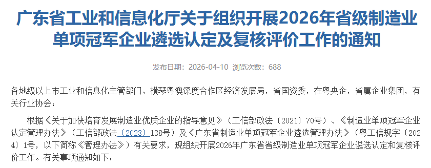 这是广东省工信厅组织开展的2026年省级制造业单项冠军企业申报和复核工作,主要面向在细分领域长期深耕、市场地位突出、创新能力较强的企业。