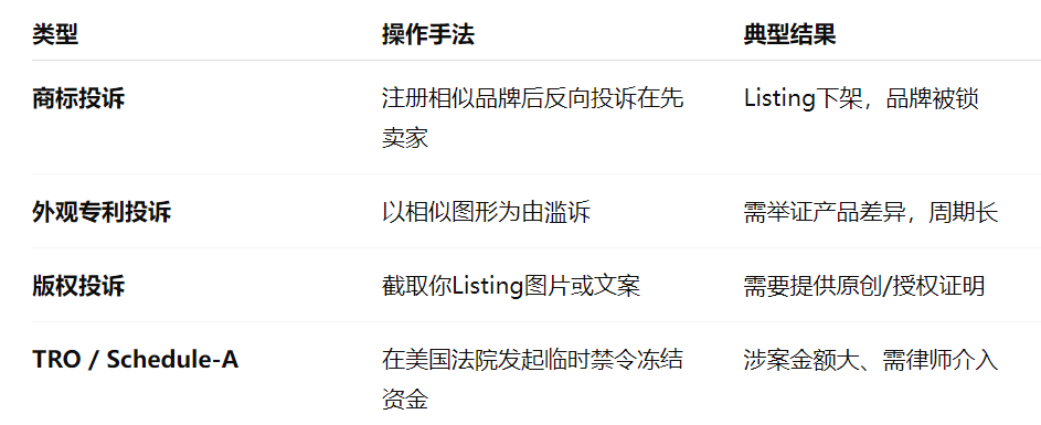 一、从“维权”到“维害” 在亚马逊、Temu、速卖通等平台上,“知识产权投诉”原本是保护创新者的正当工具,但越来越多卖家发现,这把“保护伞”被部分竞争对手当成了商业武器。 他们注册近似商标、复制常见外观,再对市场热销Listing发起批量投诉。目的不是维权,而是压制竞品、封店、冻结资金。 二、常见的“恶意套路”有哪些? 三、卖家第一时间该怎么做? 01. 冷静确认投诉类型 02. 保存所有证据链 03. 初步判断是否为恶意投诉 ①投诉方并非实际权利人; ②投诉专利/商标与产品完全无关; ③同一主体群体性投诉多个卖家。 04. 合理选择应对路径 ①平台申诉:用证据证明非侵权或正当来源; ②律师函反制:要求对方撤回投诉,否则追责; ③不侵权报告/DJ诉讼:主动在美国法院提起确认不侵权,快速解冻资金。 四、处理不同阶段的正确思路 ✅ 平台阶段 目标:解除Listing下架、恢复销售。 ✅ 法律阶段 若已进入TRO/Schedule-A阶段: 尽快与律师对接,确认案件号、冻结金额; 判断是否适合和解、部分解冻或反诉; 通过专业文件(如Settlement Agreement、Motion to Unfreeze)进行法律路径解冻。 五、如何从根源上预防“被恶意”? 1.新品上架前检索IP风险,避免踩坑; 2.核心款尽早注册商标和外观,构建防御; 3.定期监控竞品投诉记录,预判风险; 4.建立应急预案:包括申诉模板、律师资源库、证据留档机制。 跨境平台的竞争越来越激烈,“恶意投诉”正在成为新的灰色手段。 快速判断 + 准确申诉 + 及时反制,才是应对恶意投诉的核心能力。