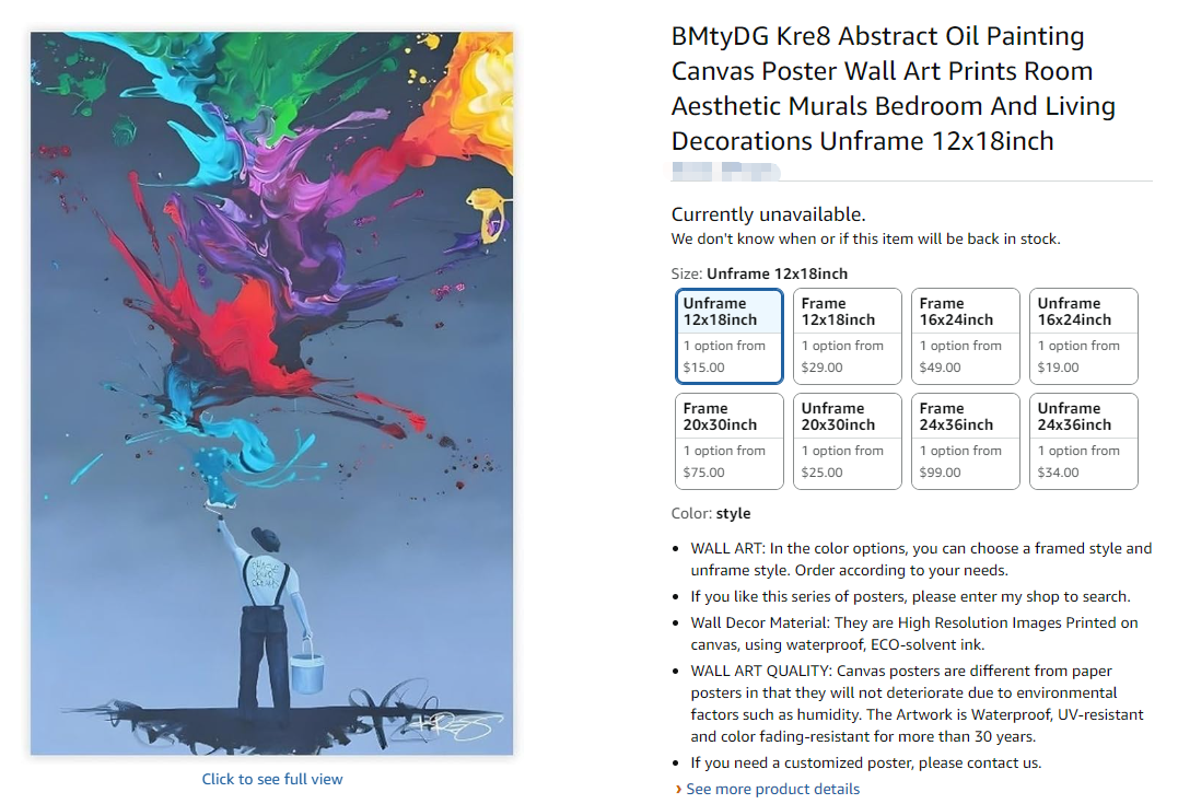 案件信息 原告品牌:Kevin Vigil 版权画 原告公司:Kevin Vigil 案件编号:26-cv-4517 起诉类型:版权 原告律所:Keith 起诉时间:2026/4/22 品牌介绍 Kre8 是美国当代艺术品牌,由艺术家 Kevin Vigil 创立,专注于街头艺术、抽象与超现实风格的创作。品牌作品色彩鲜明、构图独特,涵盖手绘油画与限量印刷艺术品,面向画廊展览、收藏与艺术市场,致力于将现代艺术的个性与视觉冲击力带入日常生活。 版权信息 本案涉及的版权信息如下,未经授权以下图片及原告官网的其他作品都不能擅自使用,请卖家们仔细排查,避免侵权! 产品示例 免责声明:图片来源于公开渠道,仅供参考,如有侵权请联系删除。 联系我们 如您收到涉及 TRO 的相关通知,且店铺资金出现受限情况,建议尽早评估处理路径。我们可免费协助进行和解金额区间预估,并提供对应的处理思路与风险提示,帮助您更清晰地判断下一步方向。